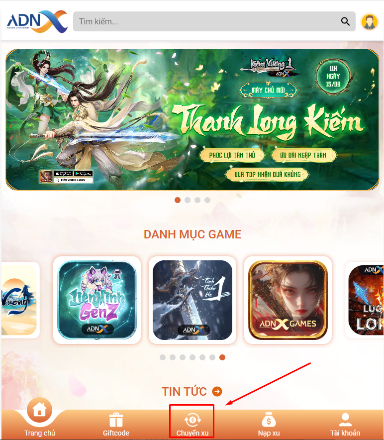 Bước 1: Tại giao diện trang chủ click chọn " Chuyển xu"