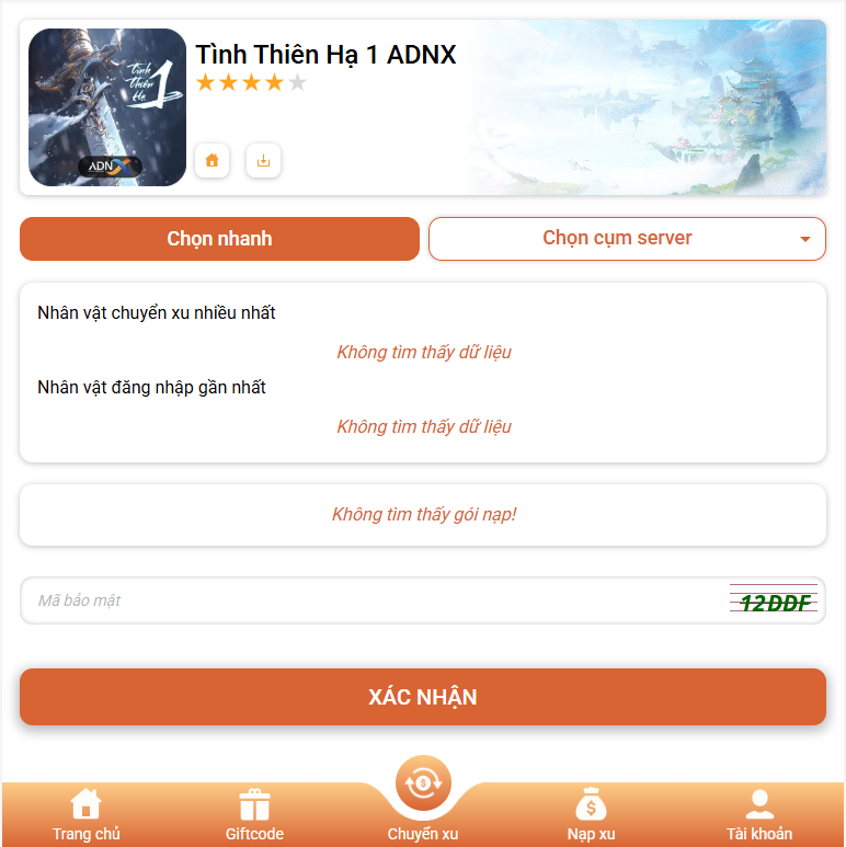 Bước 3: Chọn server - Nhân vật - số xu muốn chuyển và nhập mã bảo mật