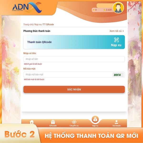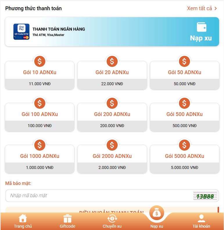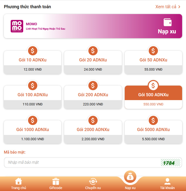 Bước 2: Chọn số tiền thanh toán và nhập mã bảo mật rồi xác nhận