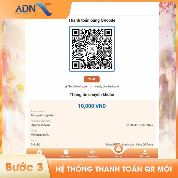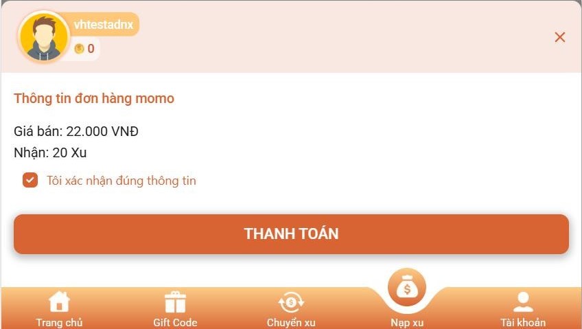 Bước 3: Nhấp chọn “Thanh toán” để chuyển sang trang thanh toán nạp.