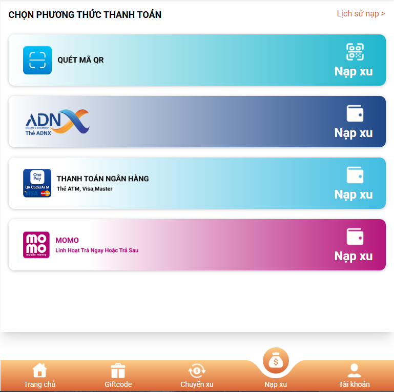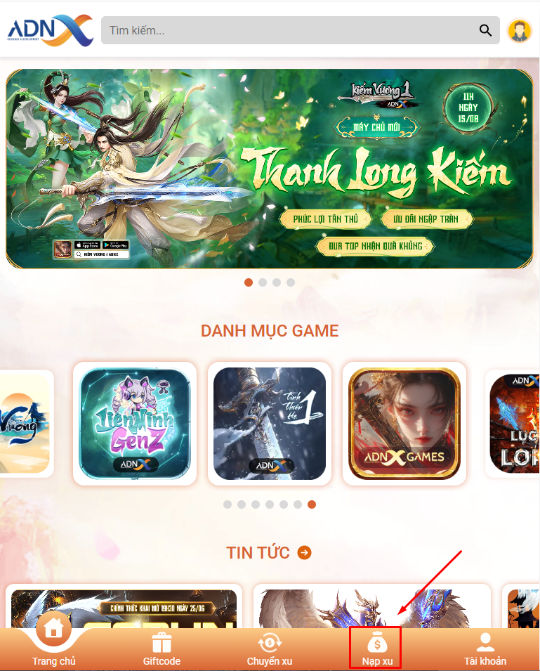 Bước 3: Click vào "Nạp Xu" để nạp tiền.