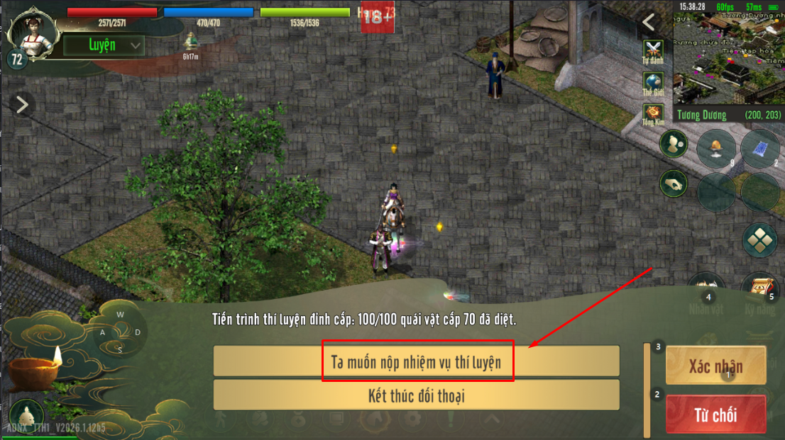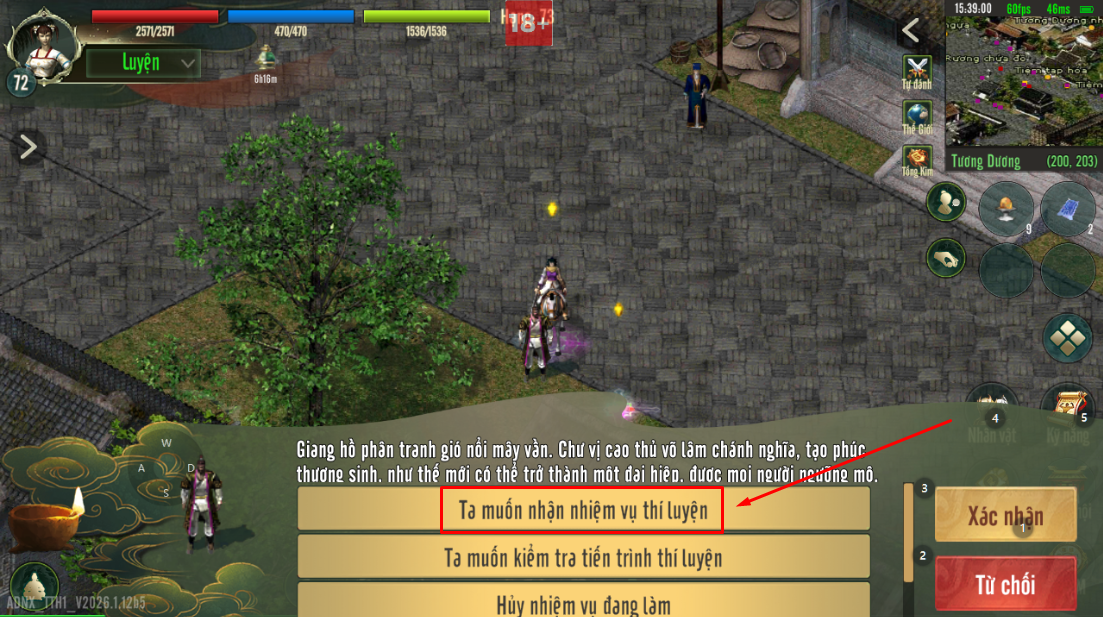 • Hệ thống sẽ tự động đưa người chơi đến gặp NPC Võ Lâm Truyền Nhân - Tọa độ (200, 203) Tương Dương